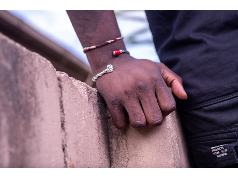Deze flexibele zilveren slavenarmband met rode ingi boka kraal van Fokko Design heeft een stijlvol Surinaams design met een goede oog voor de details. Deze zilveren slavenarmband heeft een culturele betekenis.